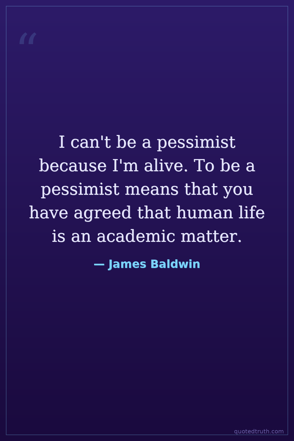 I can't be a pessimist because I'm alive. To be a pessimist means that you have agreed that human life is an academic matter.