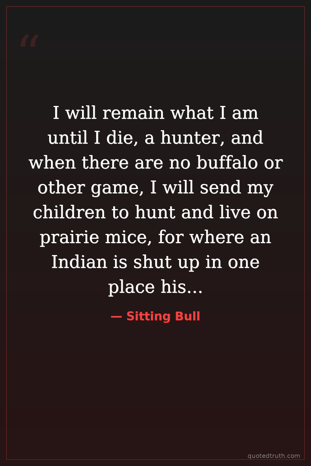 I will remain what I am until I die, a hunter, and when there are no buffalo or other game, I will send my children to hunt and live on prairie mice, for where an Indian is shut up in one place his body becomes weak.