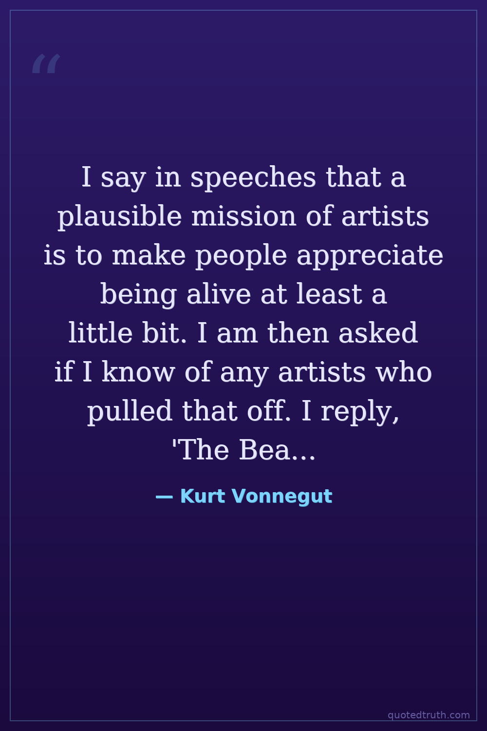 I say in speeches that a plausible mission of artists is to make people appreciate being alive at least a little bit. I am then asked if I know of any artists who pulled that off. I reply, 'The Beatles.'