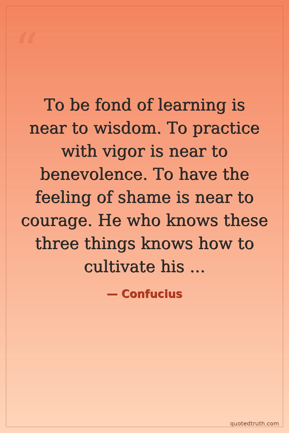 To be fond of learning is near to wisdom. To practice with vigor is near to benevolence. To have the feeling of shame is near to courage. He who knows these three things knows how to cultivate his own character. He who knows how to cultivate his own character knows how to govern other men. He who knows how to govern other men knows how to govern the kingdom with all its States and families.