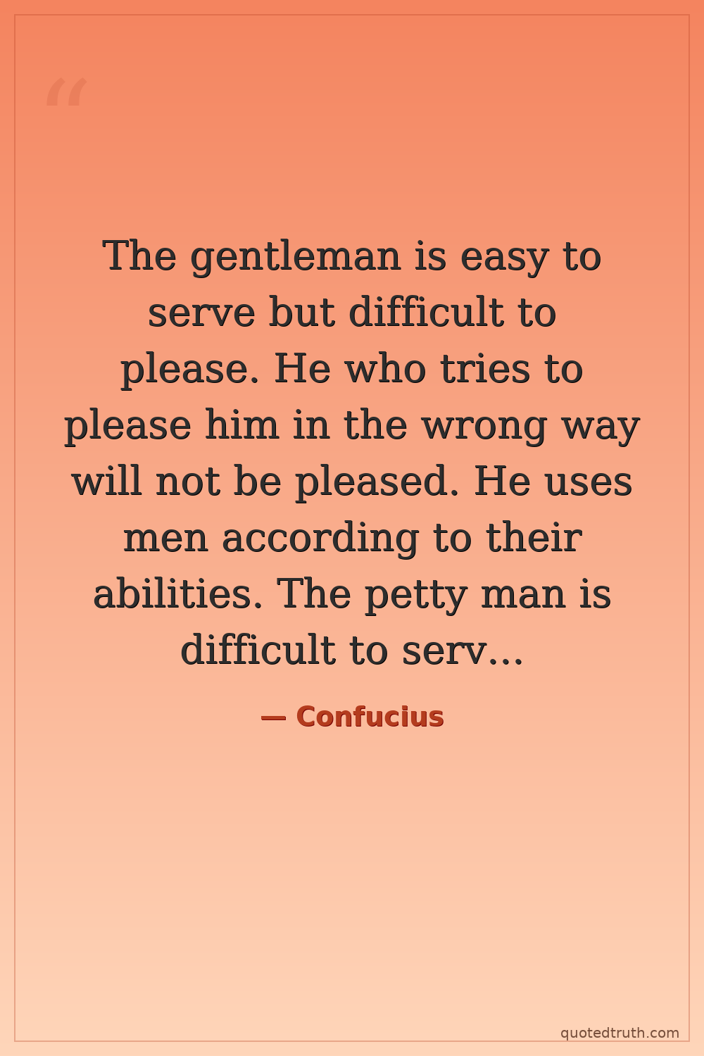 The gentleman is easy to serve but difficult to please. He who tries to please him in the wrong way will not be pleased. He uses men according to their abilities. The petty man is difficult to serve and easy to please. He who tries to please him in the wrong way will be pleased. He demands perfection in everything.