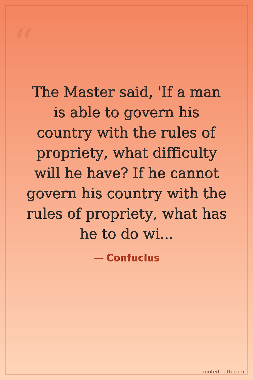 The Master said, 'If a man is able to govern his country with the rules of propriety, what difficulty will he have? If he cannot govern his country with the rules of propriety, what has he to do with the rules of propriety?'
