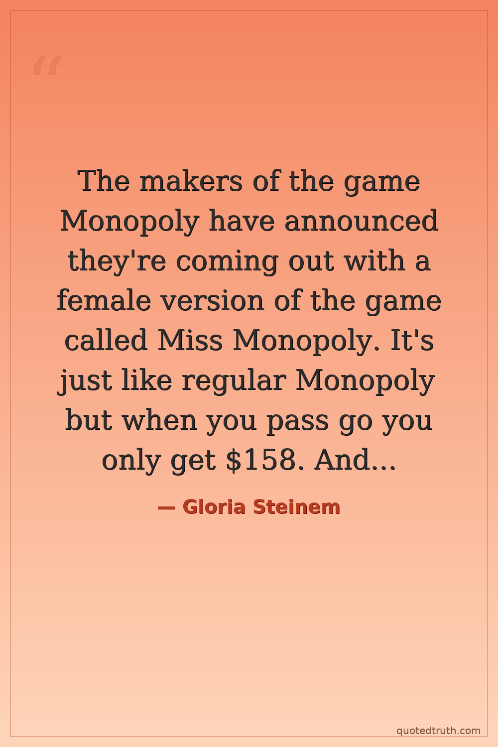 The makers of the game Monopoly have announced they're coming out with a female version of the game called Miss Monopoly. It's just like regular Monopoly but when you pass go you only get $158. And that's only if you're white.