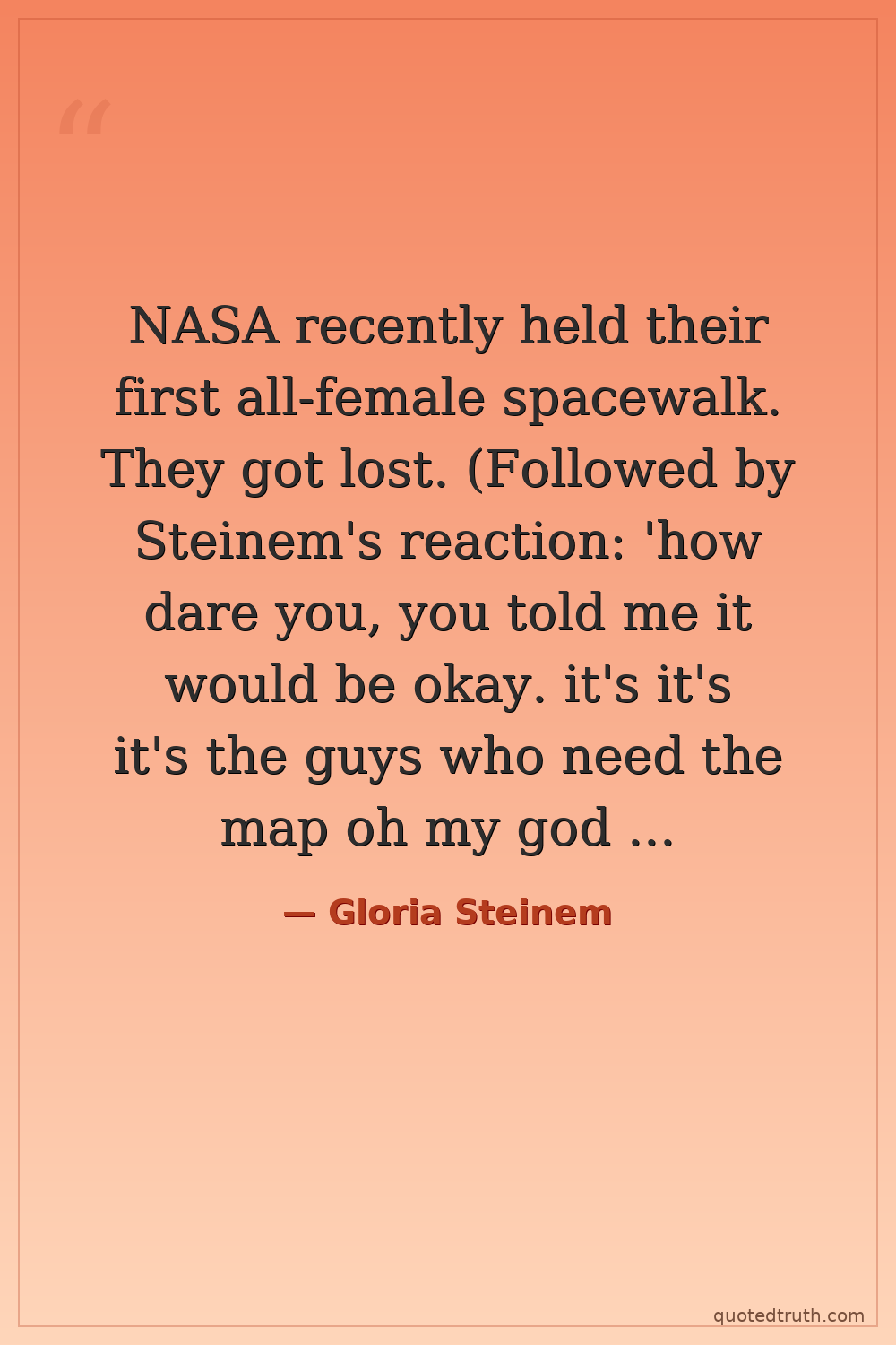 NASA recently held their first all-female spacewalk. They got lost. (Followed by Steinem's reaction: 'how dare you, you told me it would be okay. it's it's it's the guys who need the map oh my god shame on you black women and lesbians and feminist icons are liars.')