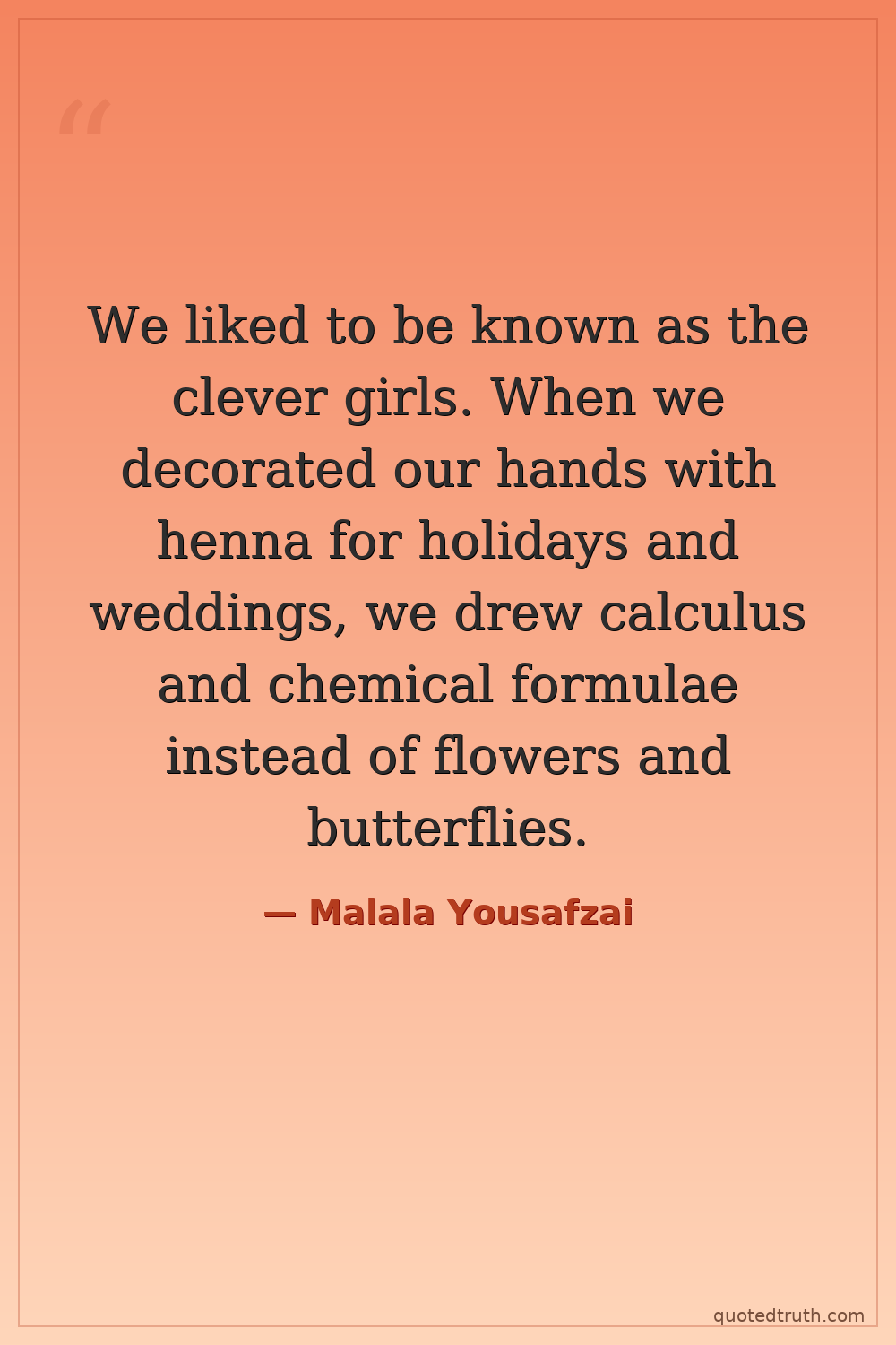 We liked to be known as the clever girls. When we decorated our hands with henna for holidays and weddings, we drew calculus and chemical formulae instead of flowers and butterflies.