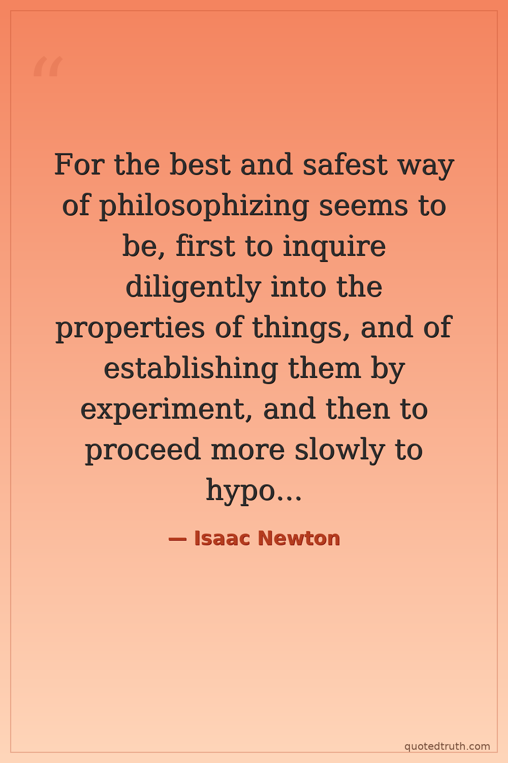 For the best and safest way of philosophizing seems to be, first to inquire diligently into the properties of things, and of establishing them by experiment, and then to proceed more slowly to hypotheses for the explanation of them. — Isaac Newton Early Modern Laws of motion and gravity