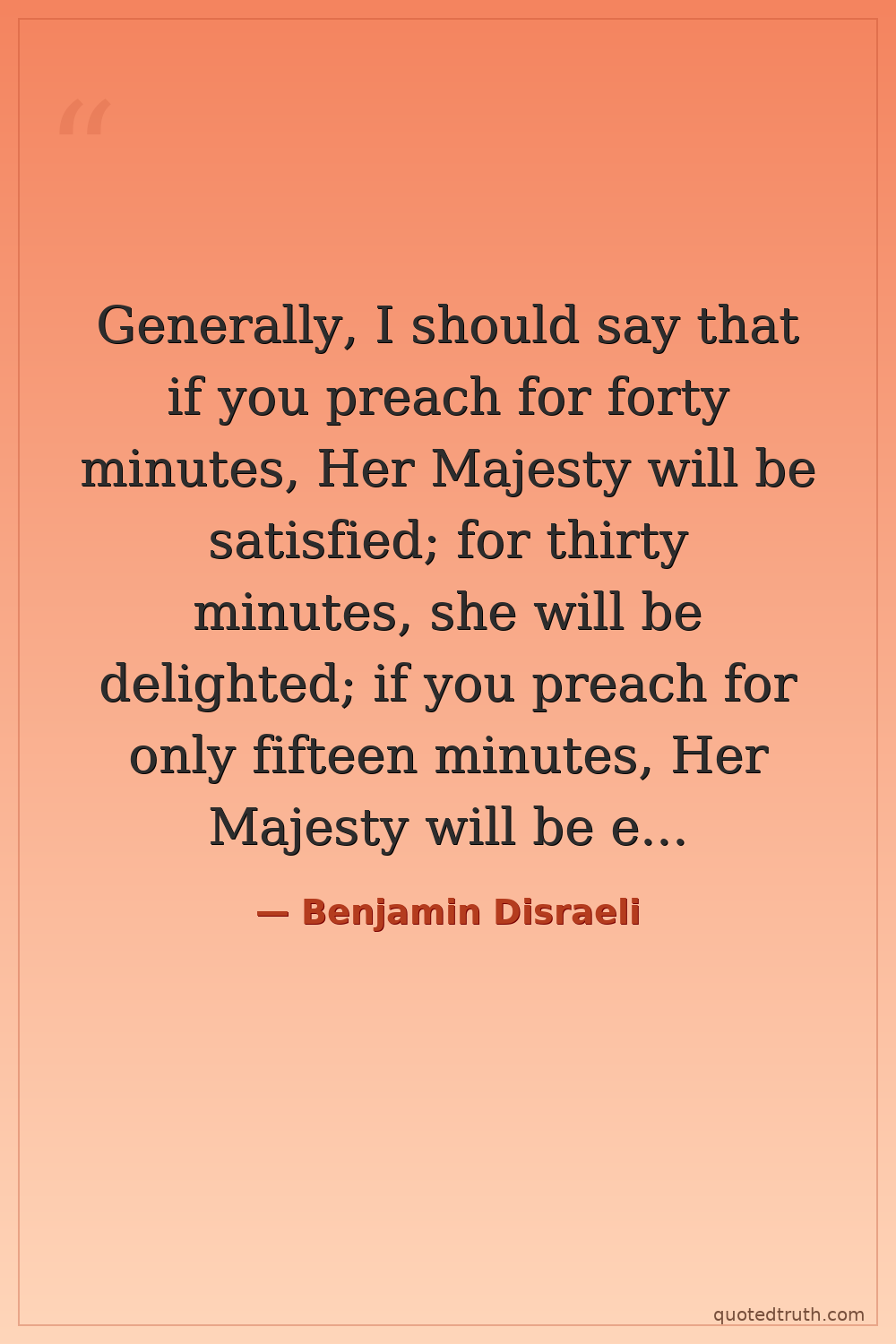 Generally, I should say that if you preach for forty minutes, Her Majesty will be satisfied; for thirty minutes, she will be delighted; if you preach for only fifteen minutes, Her Majesty will be enthusiastic.