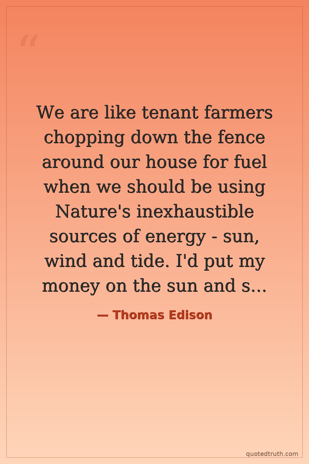We are like tenant farmers chopping down the fence around our house for fuel when we should be using Nature's inexhaustible sources of energy - sun, wind and tide. I'd put my money on the sun and solar energy. What a source of power! I hope we don't have to wait until oil and coal run out before we tackle that.