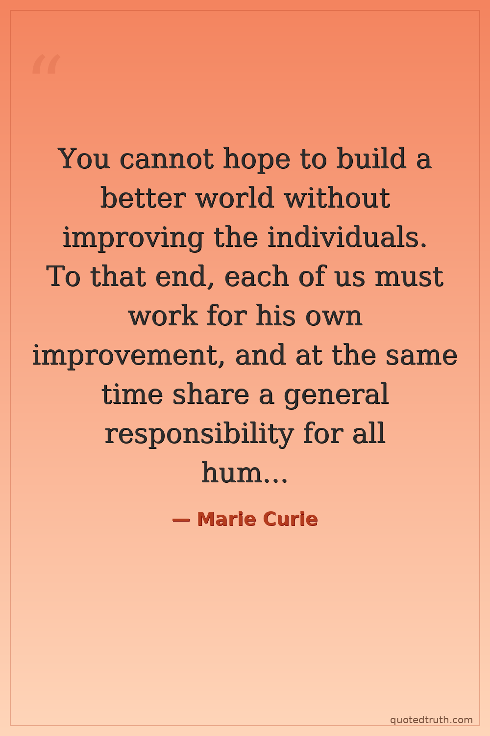 You cannot hope to build a better world without improving the individuals. To that end, each of us must work for his own improvement, and at the same time share a general responsibility for all humanity, our particular duty being to aid those to whom we think we can be most useful.