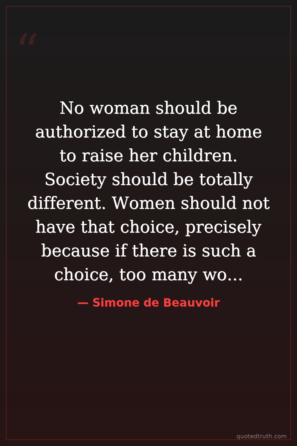 No woman should be authorized to stay at home to raise her children. Society should be totally different. Women should not have that choice, precisely because if there is such a choice, too many women will make that one.