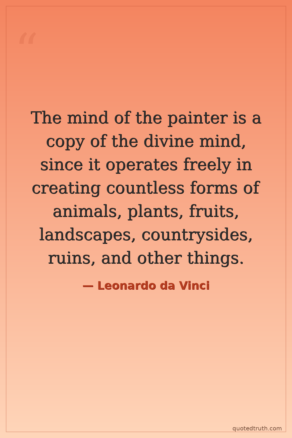 The mind of the painter is a copy of the divine mind, since it operates freely in creating countless forms of animals, plants, fruits, landscapes, countrysides, ruins, and other things.