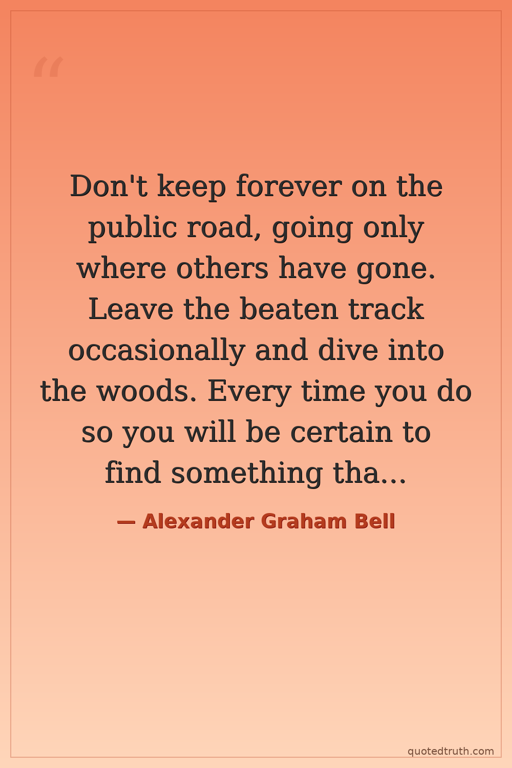 Don't keep forever on the public road, going only where others have gone. Leave the beaten track occasionally and dive into the woods. Every time you do so you will be certain to find something that you have never seen before.