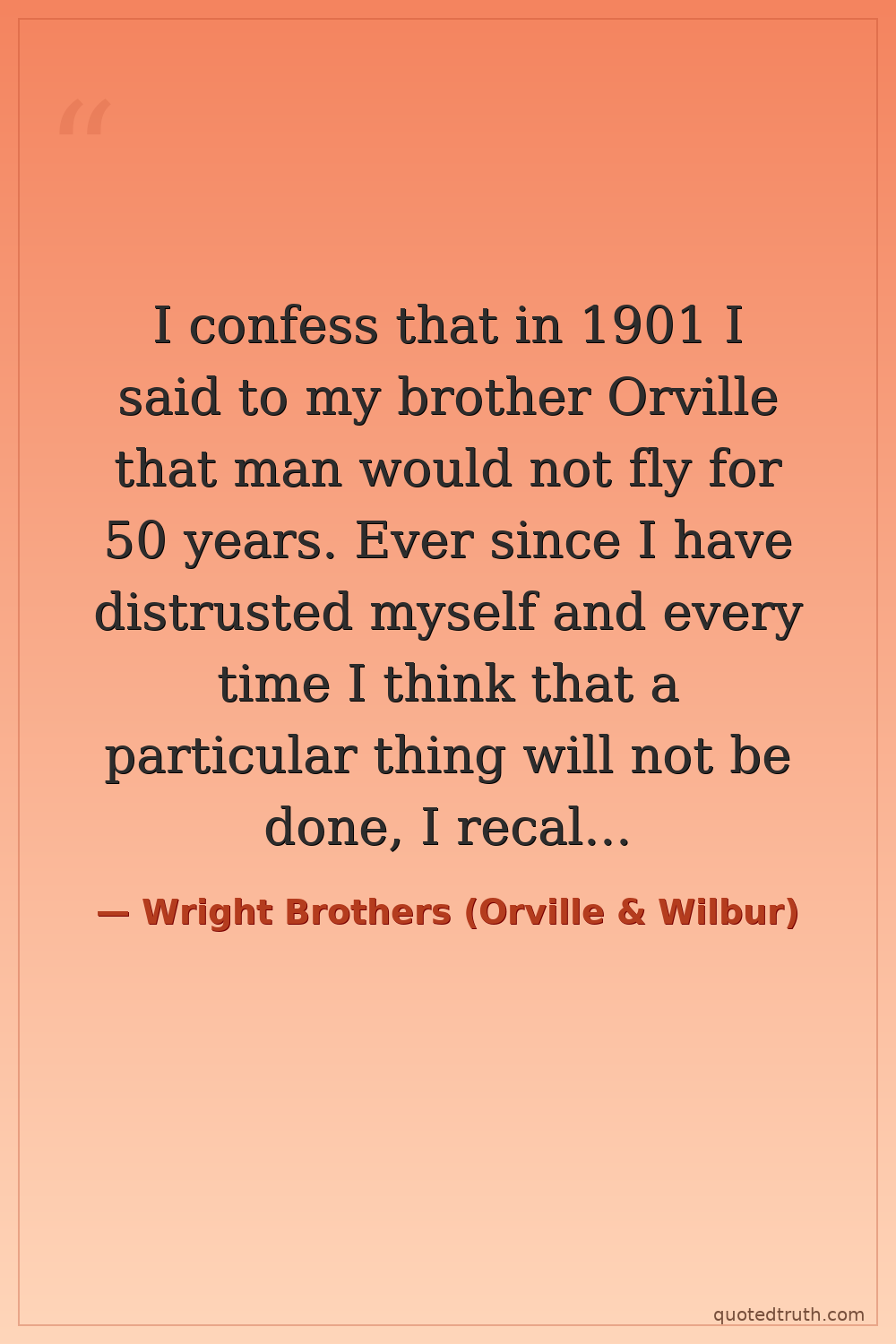 I confess that in 1901 I said to my brother Orville that man would not fly for 50 years. Ever since I have distrusted myself and every time I think that a particular thing will not be done, I recall that it is probably a wrong conclusion. — Wright Brothers (Orville & Wilbur) Modern First powered flight