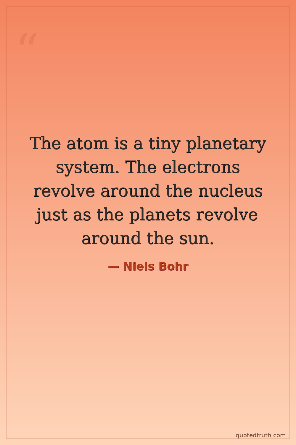The atom is a tiny planetary system. The electrons revolve around the nucleus just as the planets revolve around the sun.