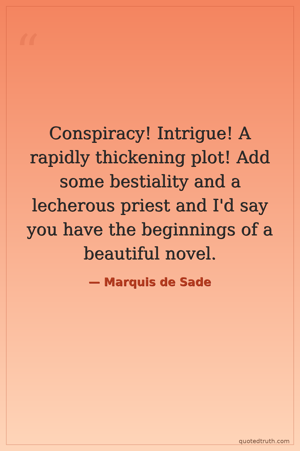 Conspiracy! Intrigue! A rapidly thickening plot! Add some bestiality and a lecherous priest and I'd say you have the beginnings of a beautiful novel.