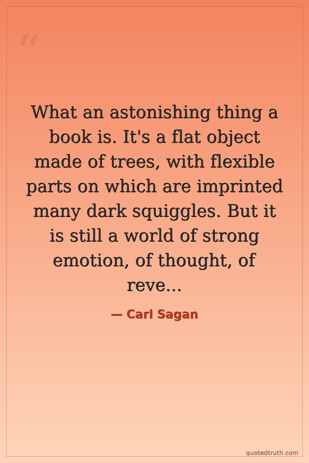 What an astonishing thing a book is. It's a flat object made of trees, with flexible parts on which are imprinted many dark squiggles. But it is still a world of strong emotion, of thought, of revelation.