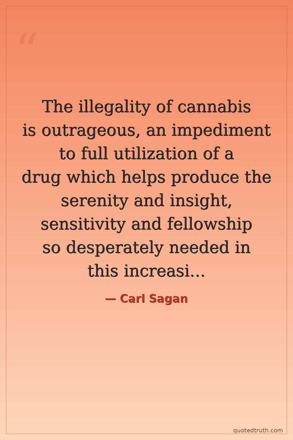The illegality of cannabis is outrageous, an impediment to full utilization of a drug which helps produce the serenity and insight, sensitivity and fellowship so desperately needed in this increasingly mad and dangerous world. — Carl Sagan Contemporary Astronomer, science communicator