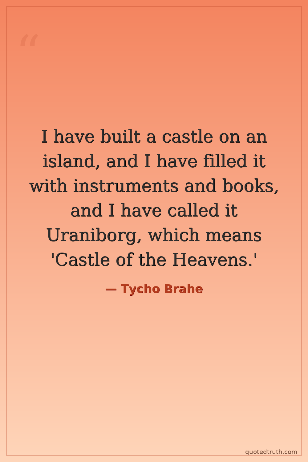 I have built a castle on an island, and I have filled it with instruments and books, and I have called it Uraniborg, which means 'Castle of the Heavens.'