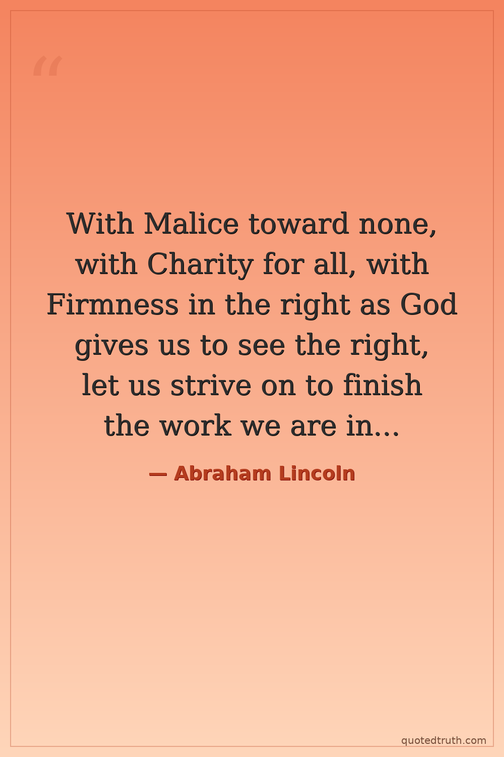 With Malice toward none, with Charity for all, with Firmness in the right as God gives us to see the right, let us strive on to finish the work we are in...
