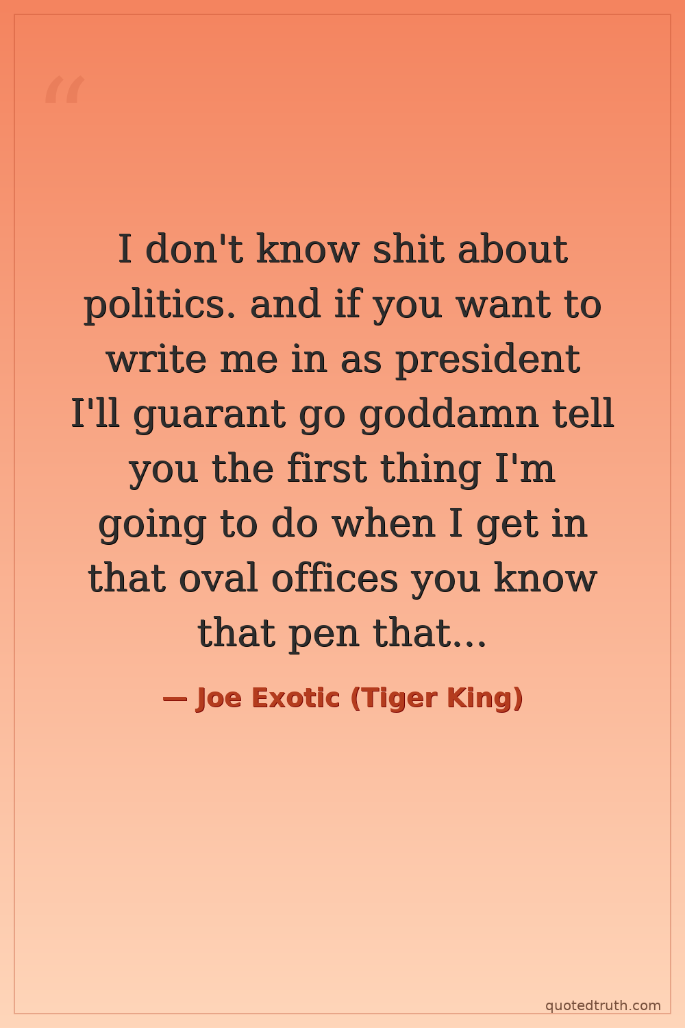 I don't know shit about politics. and if you want to write me in as president I'll guarant go goddamn tell you the first thing I'm going to do when I get in that oval offices you know that pen that they sign all them bills with that motherfucker is going in the trash.
