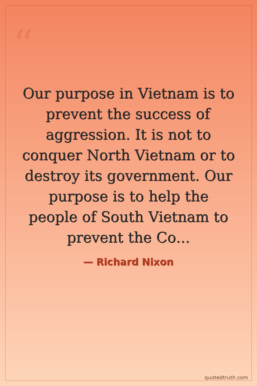 Our purpose in Vietnam is to prevent the success of aggression. It is not to conquer North Vietnam or to destroy its government. Our purpose is to help the people of South Vietnam to prevent the Communist conquest of their country. — Richard Nixon Modern US President, Watergate