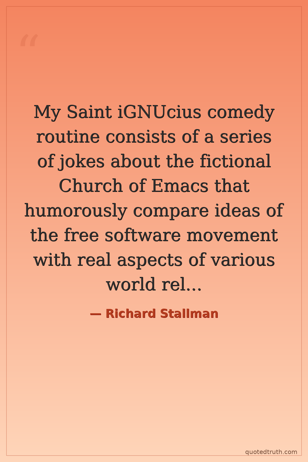 My Saint iGNUcius comedy routine consists of a series of jokes about the fictional Church of Emacs that humorously compare ideas of the free software movement with real aspects of various world religions.