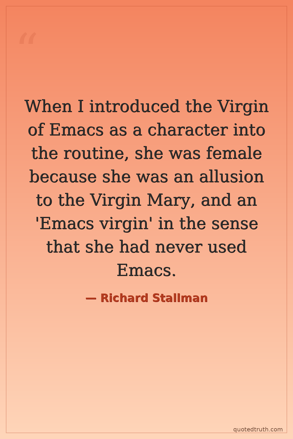 When I introduced the Virgin of Emacs as a character into the routine, she was female because she was an allusion to the Virgin Mary, and an 'Emacs virgin' in the sense that she had never used Emacs.