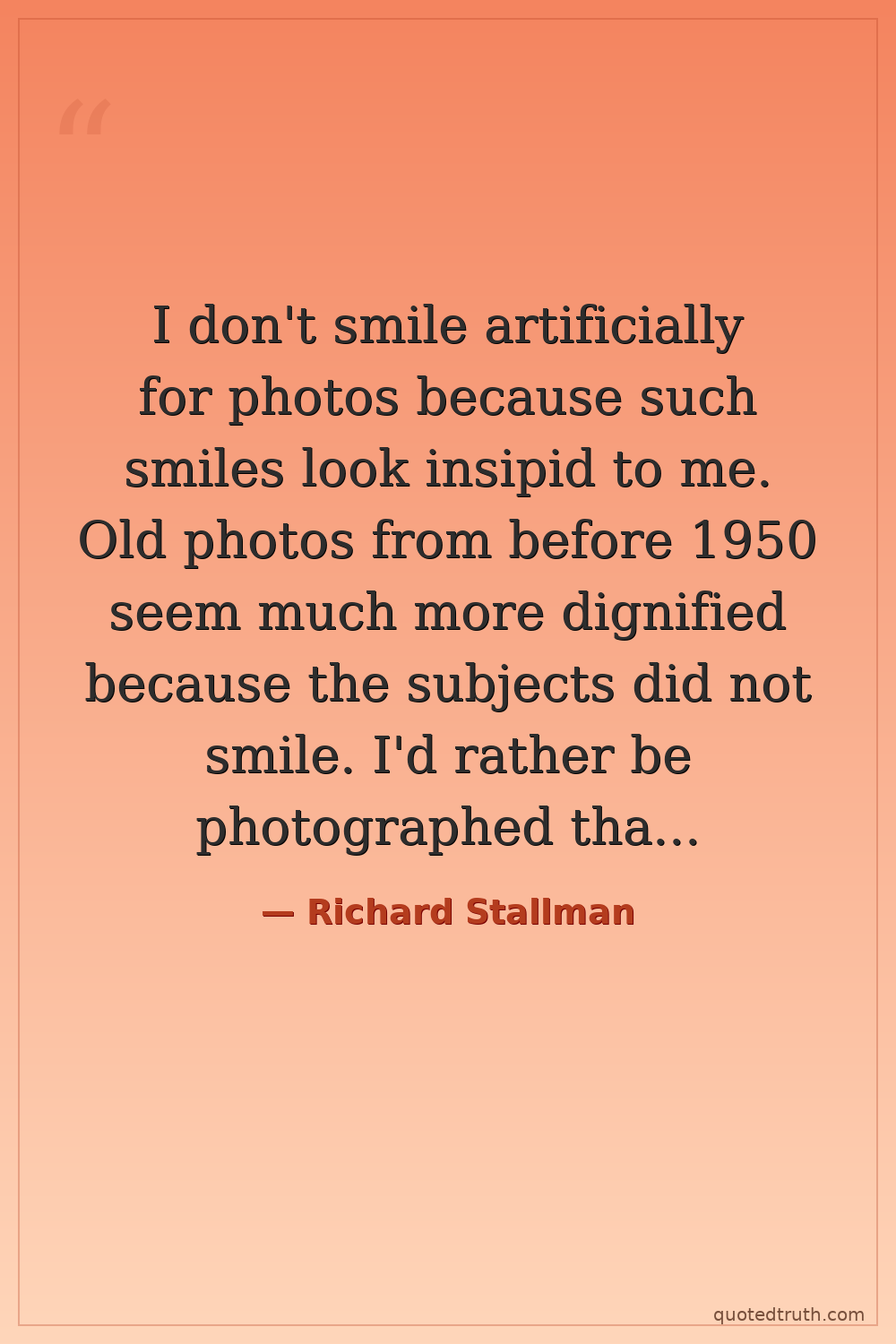 I don't smile artificially for photos because such smiles look insipid to me. Old photos from before 1950 seem much more dignified because the subjects did not smile. I'd rather be photographed that way.