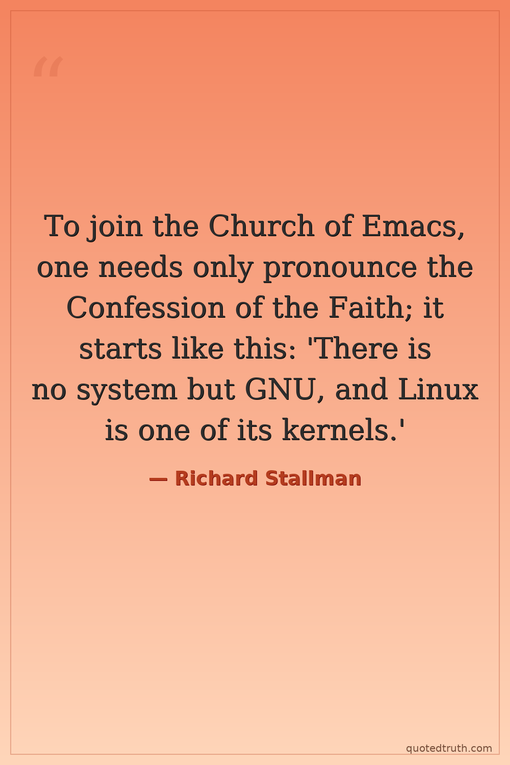 To join the Church of Emacs, one needs only pronounce the Confession of the Faith; it starts like this: 'There is no system but GNU, and Linux is one of its kernels.'