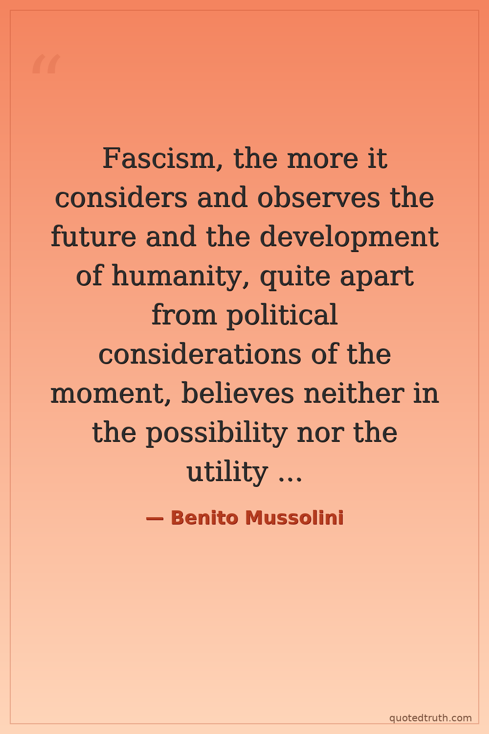 Fascism, the more it considers and observes the future and the development of humanity, quite apart from political considerations of the moment, believes neither in the possibility nor the utility of perpetual peace.