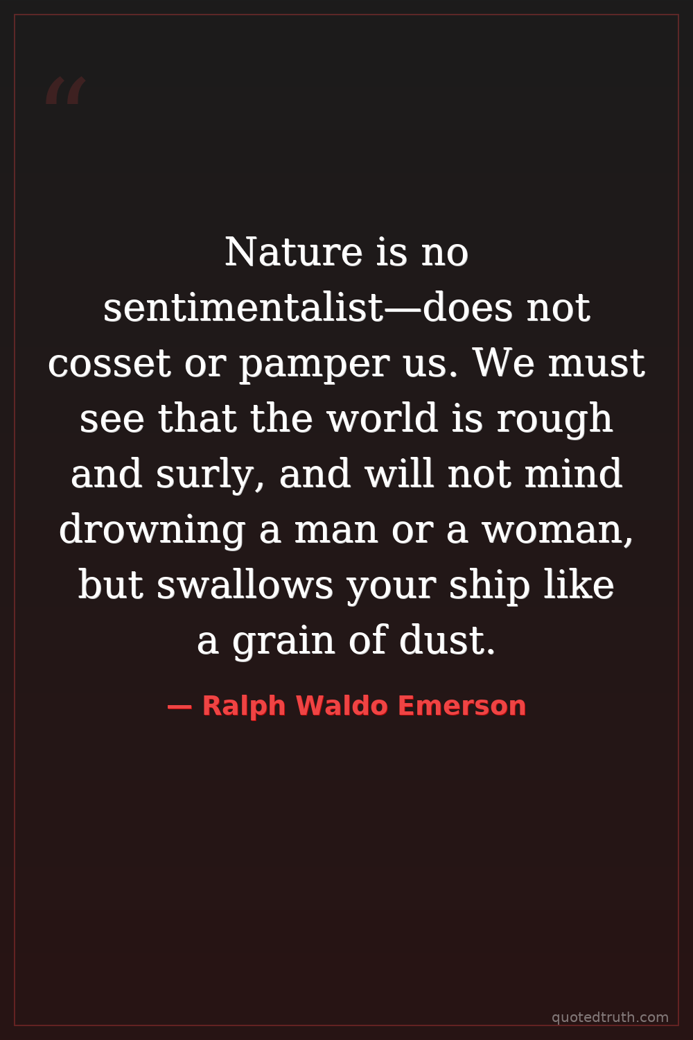 Nature is no sentimentalist—does not cosset or pamper us. We must see that the world is rough and surly, and will not mind drowning a man or a woman, but swallows your ship like a grain of dust.