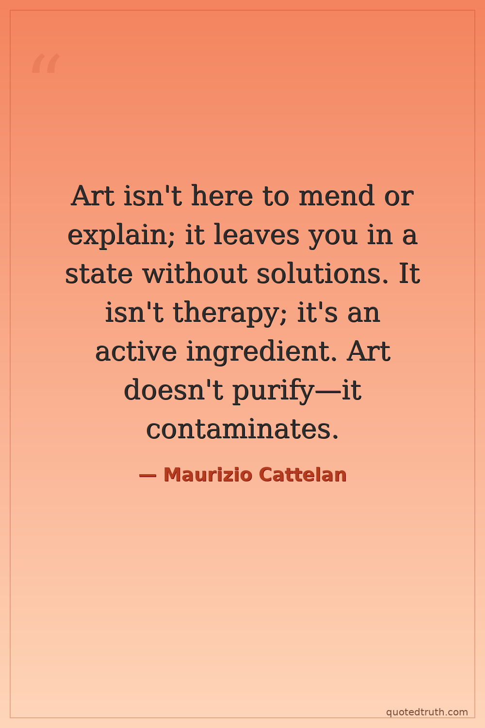 Art isn't here to mend or explain; it leaves you in a state without solutions. It isn't therapy; it's an active ingredient. Art doesn't purify—it contaminates.