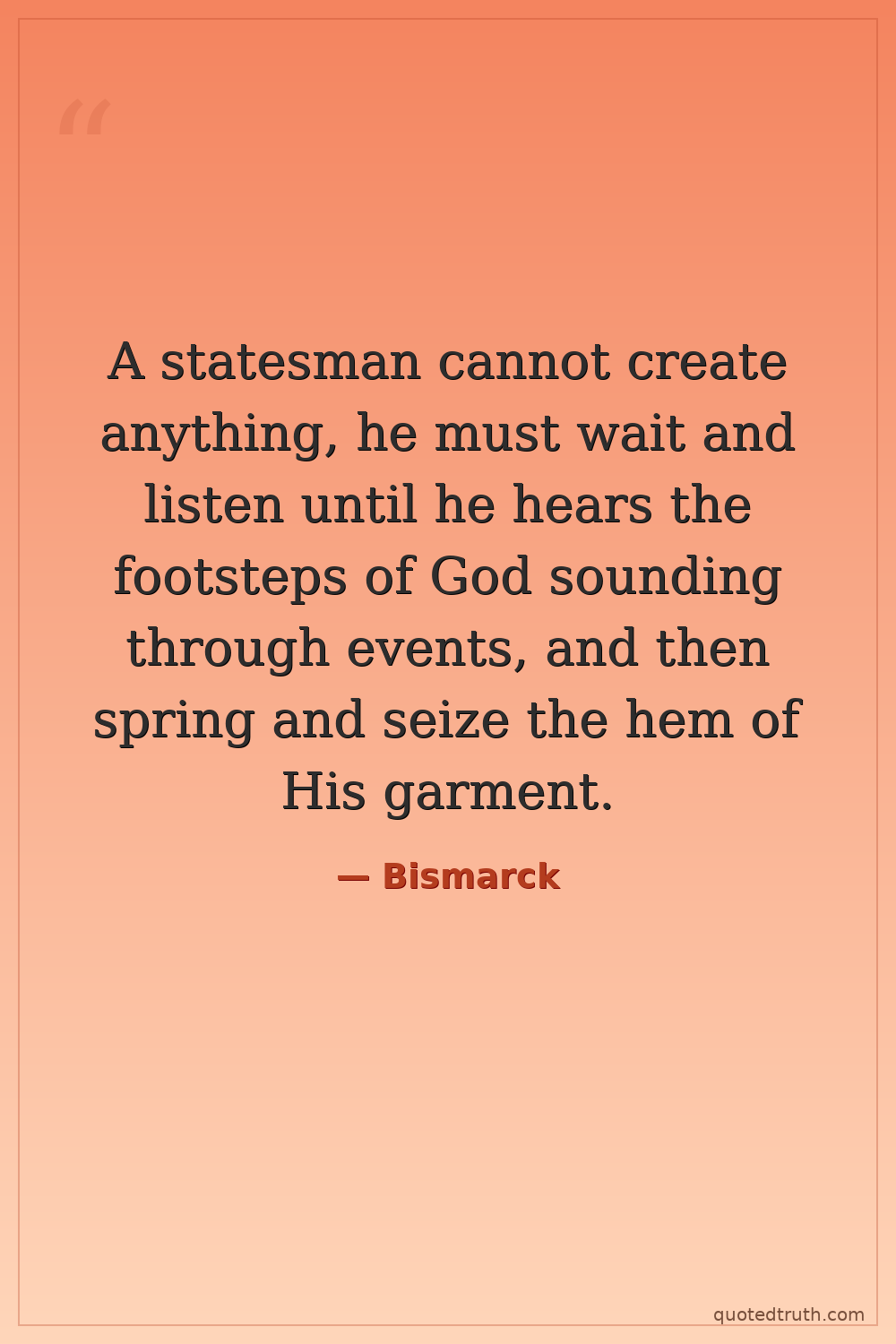 A statesman cannot create anything, he must wait and listen until he hears the footsteps of God sounding through events, and then spring and seize the hem of His garment.