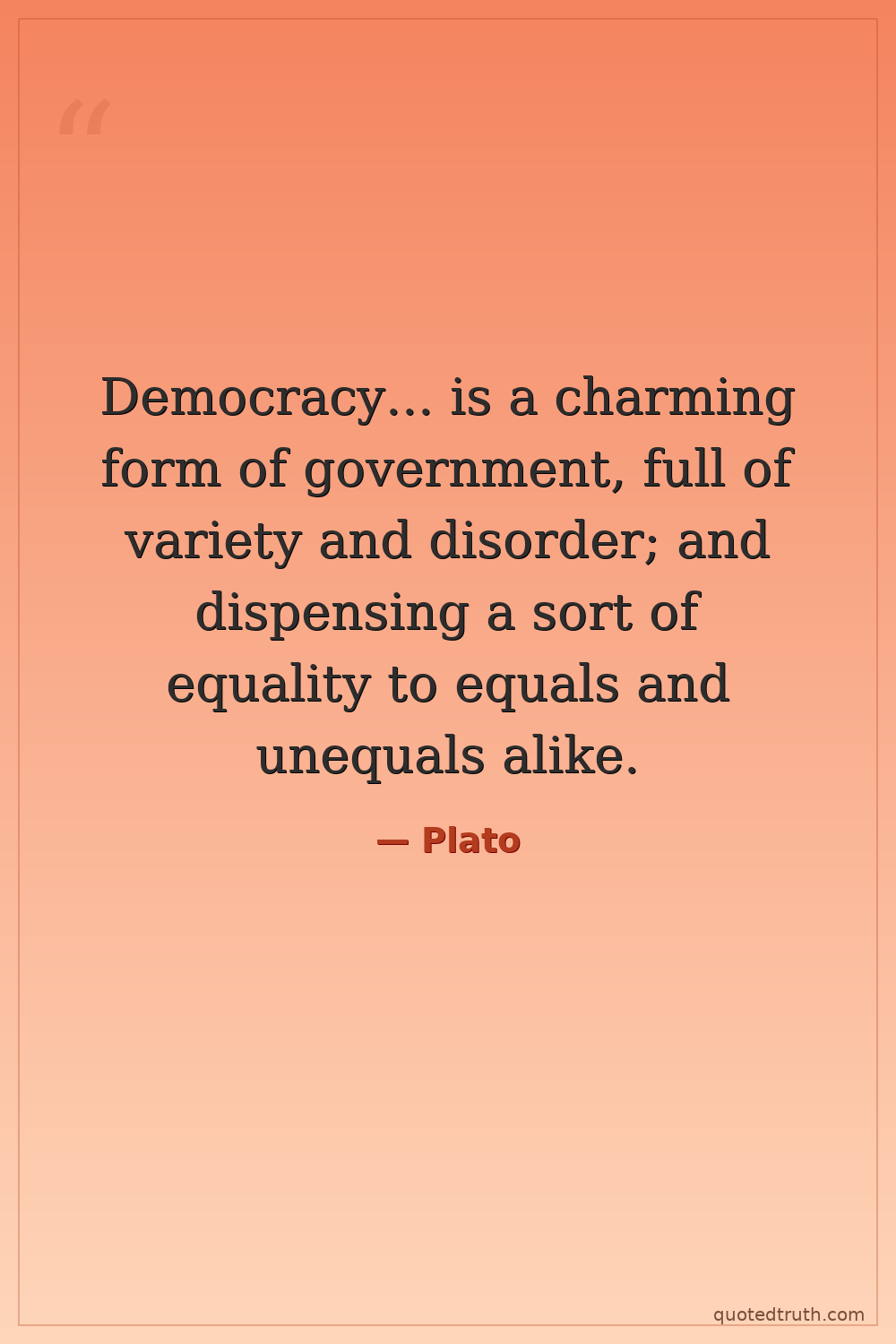 Democracy... is a charming form of government, full of variety and disorder; and dispensing a sort of equality to equals and unequals alike.