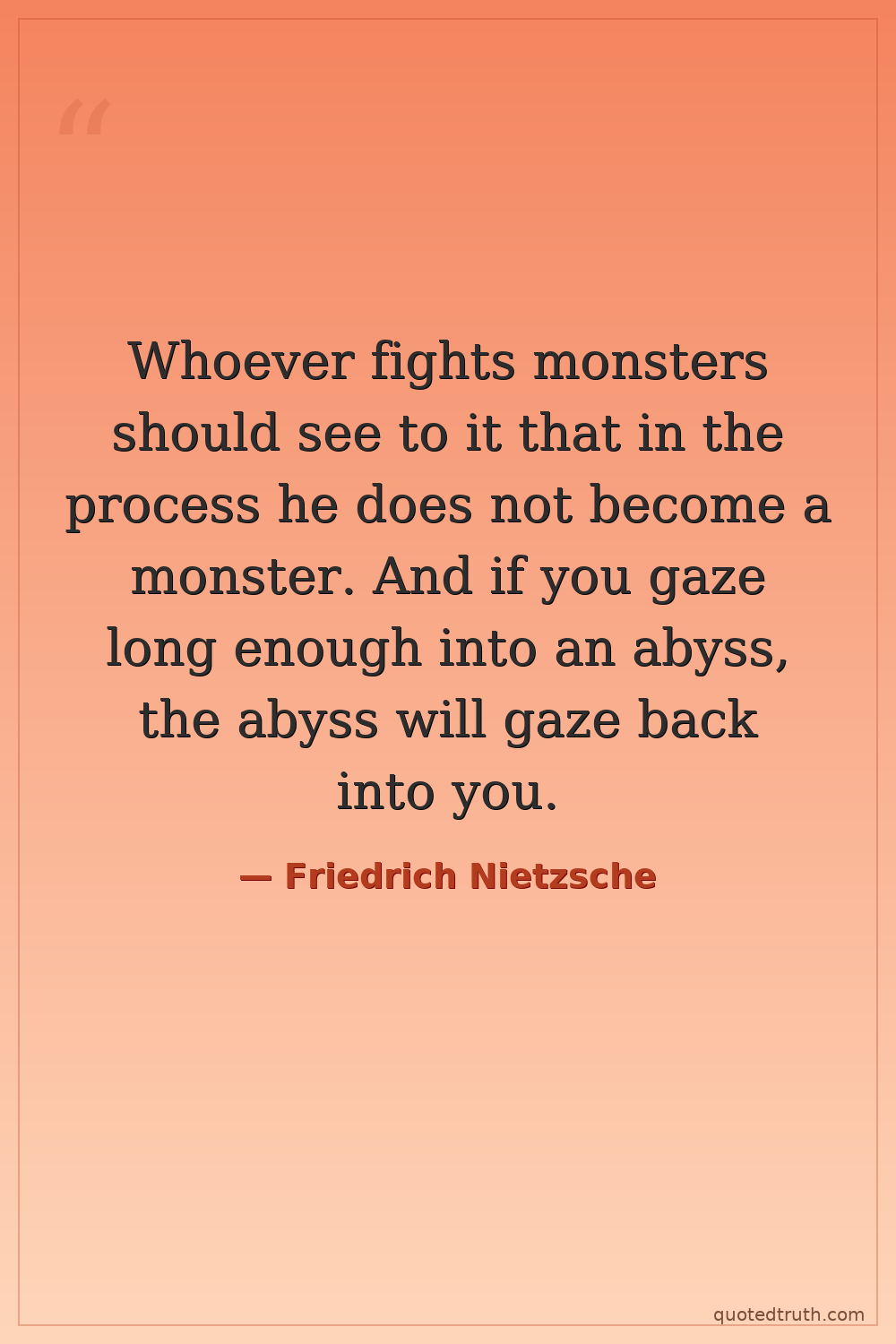 Whoever fights monsters should see to it that in the process he does not become a monster. And if you gaze long enough into an abyss, the abyss will gaze back into you.