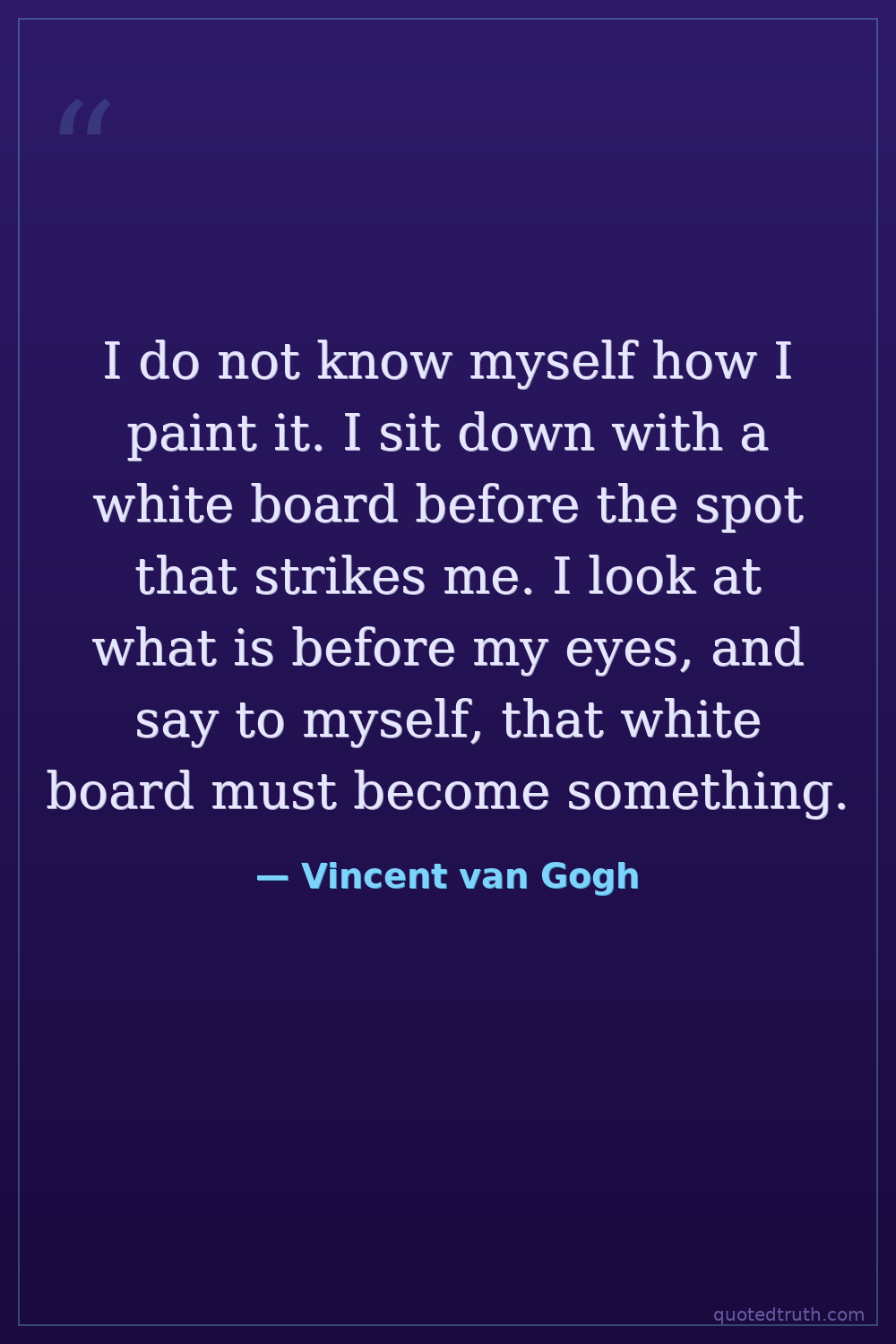 I do not know myself how I paint it. I sit down with a white board before the spot that strikes me. I look at what is before my eyes, and say to myself, that white board must become something.