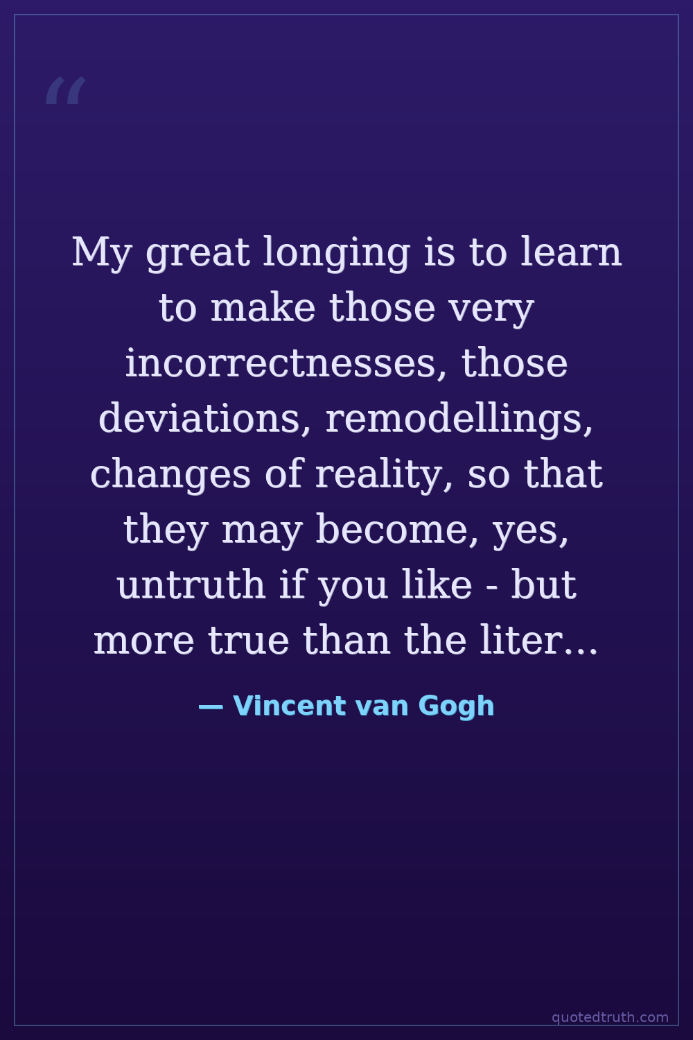 My great longing is to learn to make those very incorrectnesses, those deviations, remodellings, changes of reality, so that they may become, yes, untruth if you like - but more true than the literal truth.