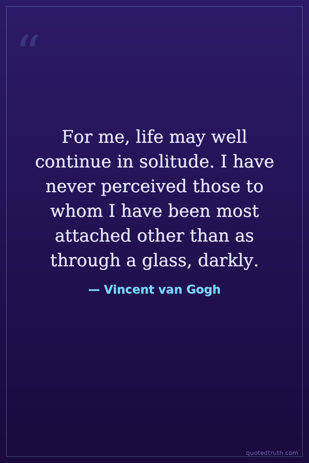 For me, life may well continue in solitude. I have never perceived those to whom I have been most attached other than as through a glass, darkly.