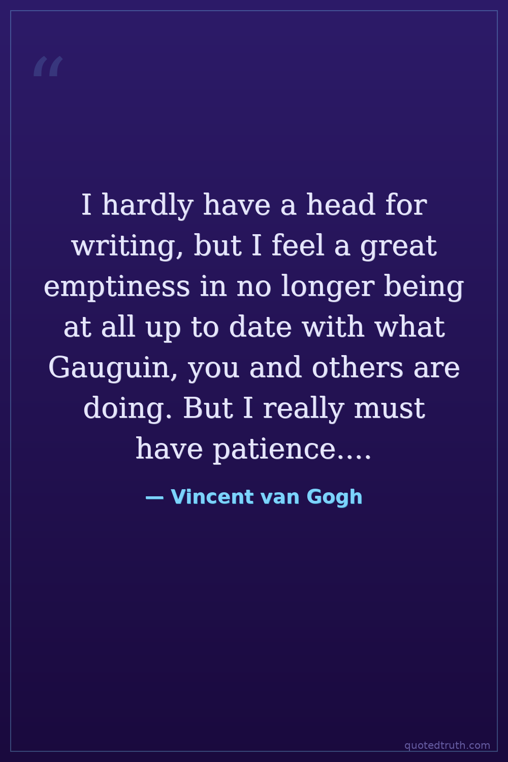 I hardly have a head for writing, but I feel a great emptiness in no longer being at all up to date with what Gauguin, you and others are doing. But I really must have patience....
