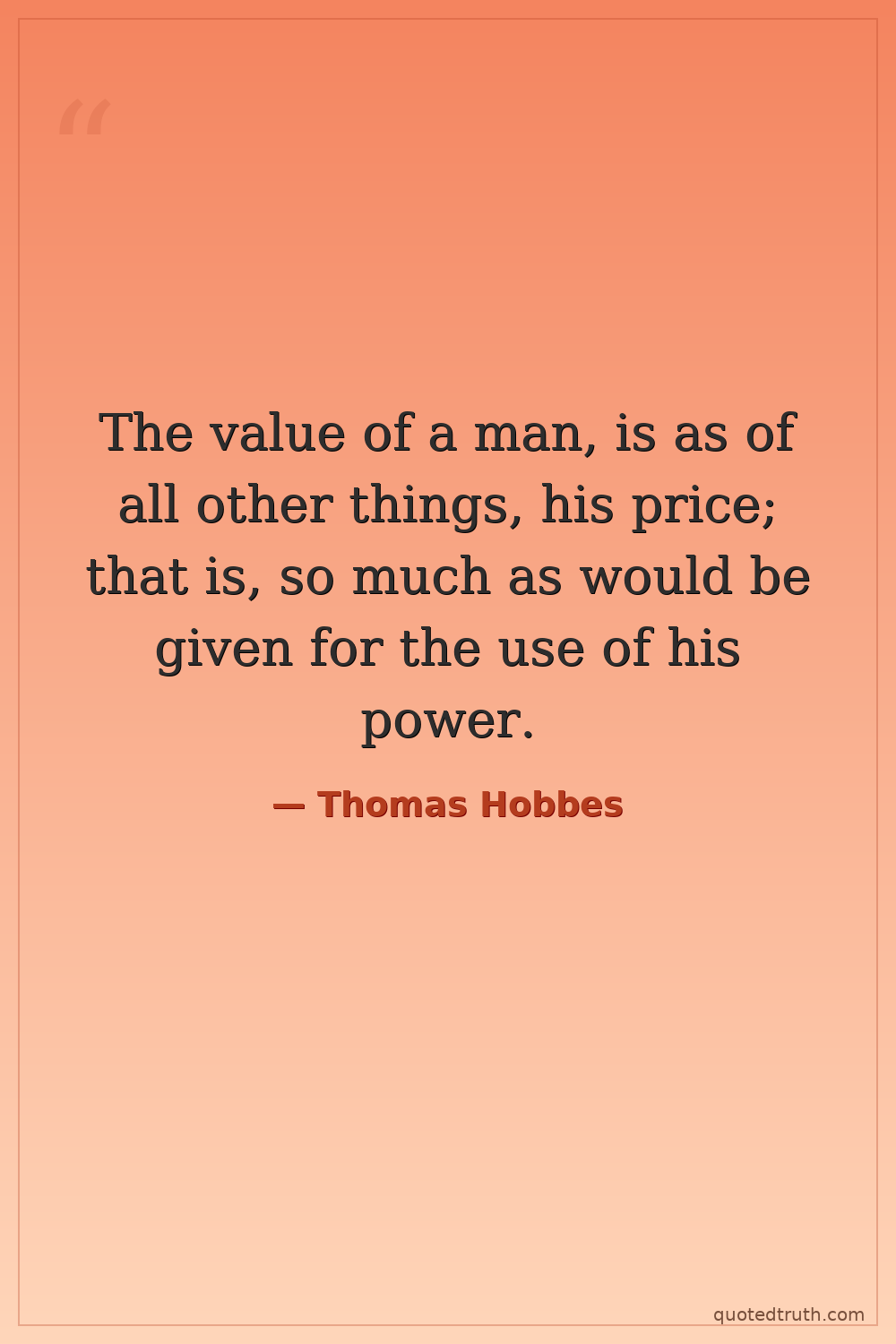 The value of a man, is as of all other things, his price; that is, so much as would be given for the use of his power.