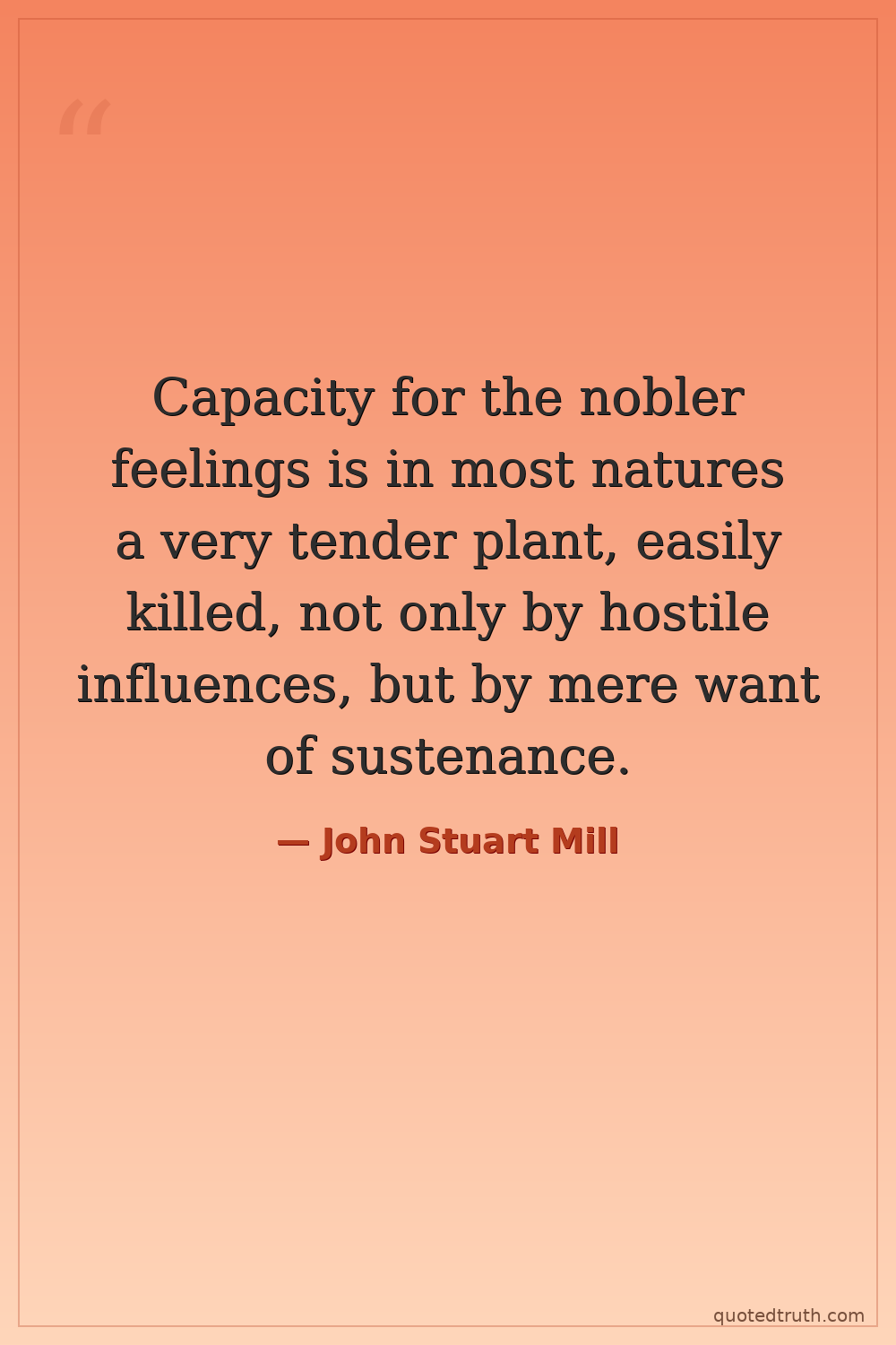 Capacity for the nobler feelings is in most natures a very tender plant, easily killed, not only by hostile influences, but by mere want of sustenance.
