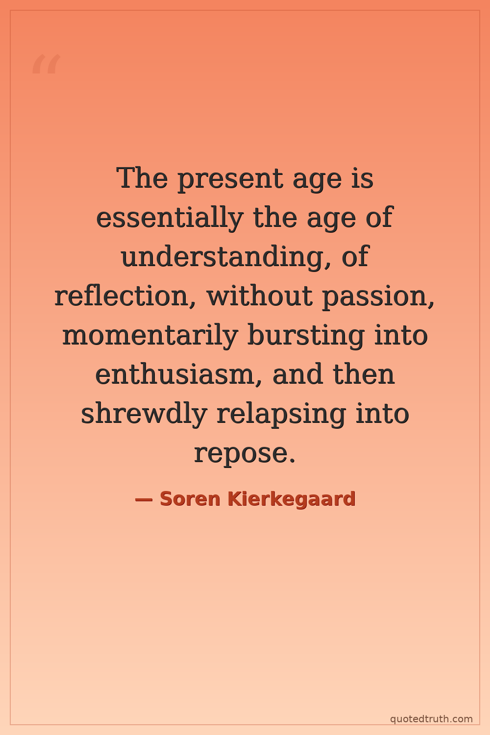 The present age is essentially the age of understanding, of reflection, without passion, momentarily bursting into enthusiasm, and then shrewdly relapsing into repose.