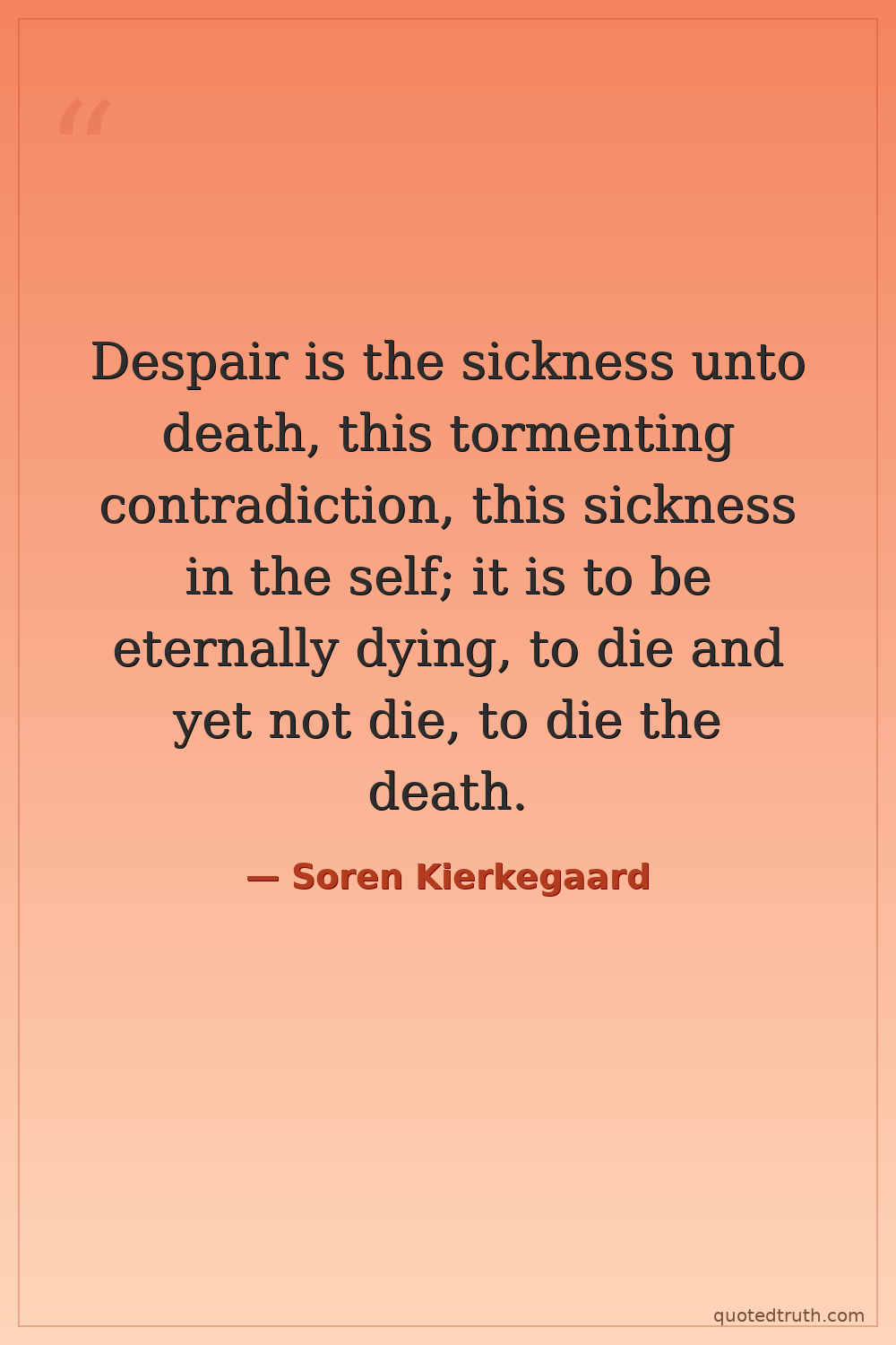 Despair is the sickness unto death, this tormenting contradiction, this sickness in the self; it is to be eternally dying, to die and yet not die, to die the death.