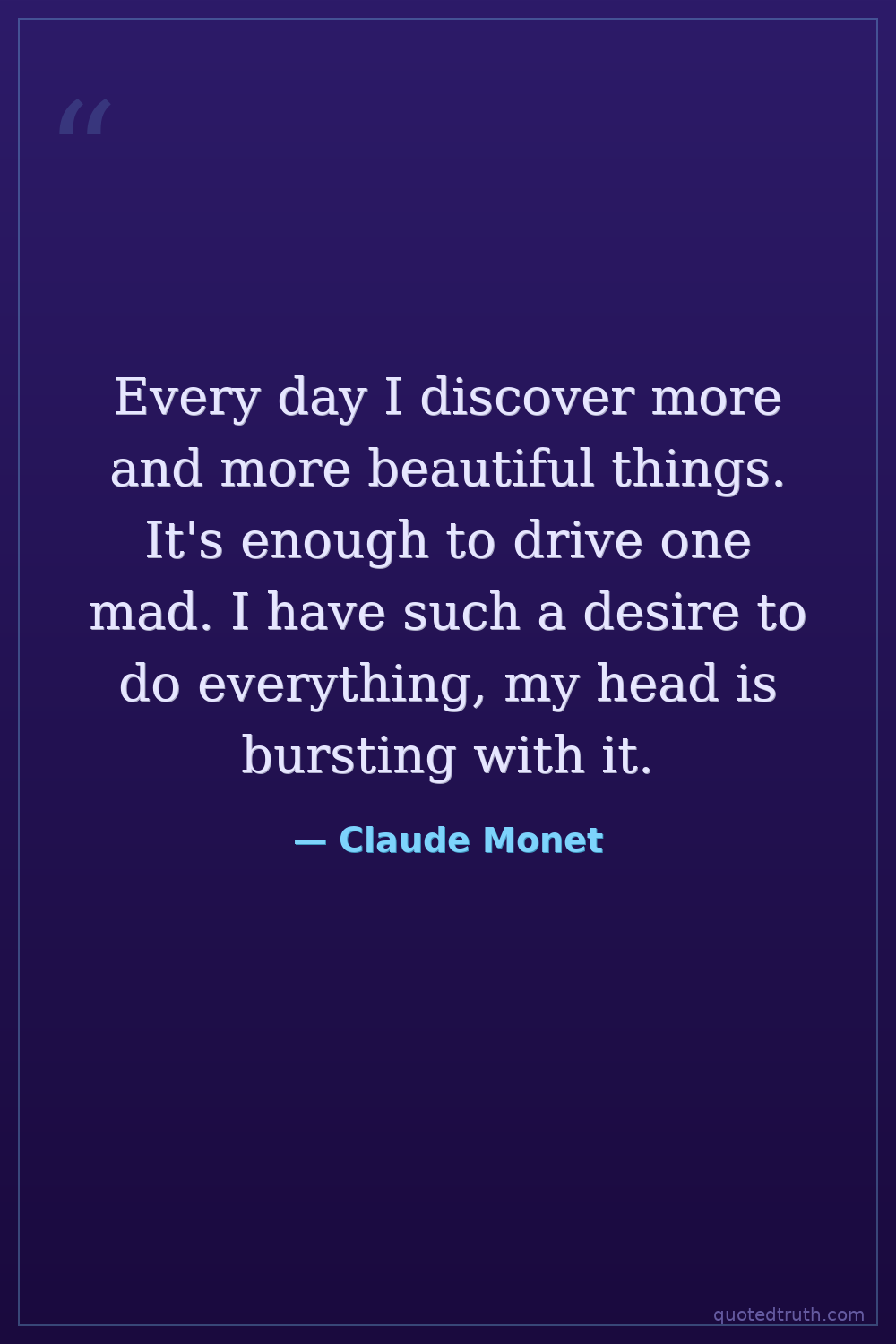 Every day I discover more and more beautiful things. It's enough to drive one mad. I have such a desire to do everything, my head is bursting with it.