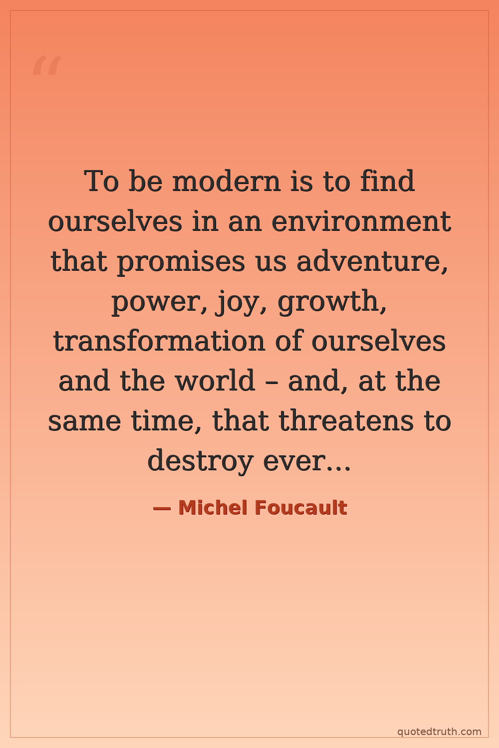 To be modern is to find ourselves in an environment that promises us adventure, power, joy, growth, transformation of ourselves and the world – and, at the same time, that threatens to destroy everything we have, everything we know, everything we are.