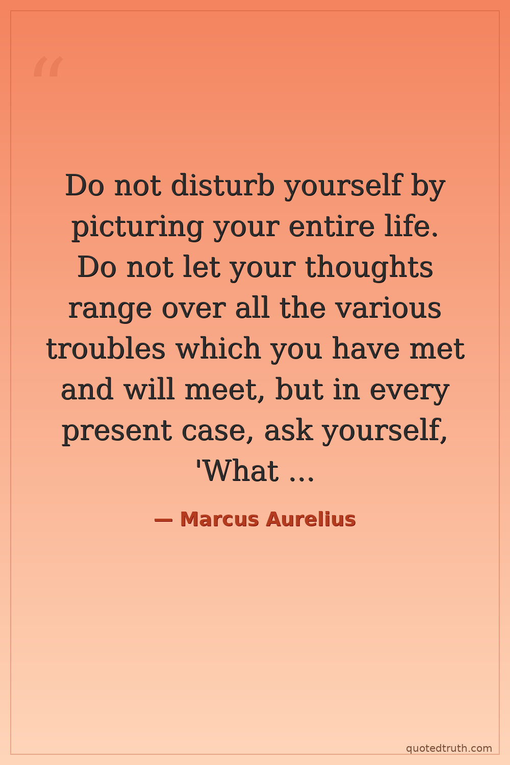 Do not disturb yourself by picturing your entire life. Do not let your thoughts range over all the various troubles which you have met and will meet, but in every present case, ask yourself, 'What is there in this that is unbearable and beyond endurance?' You would be ashamed to confess it!