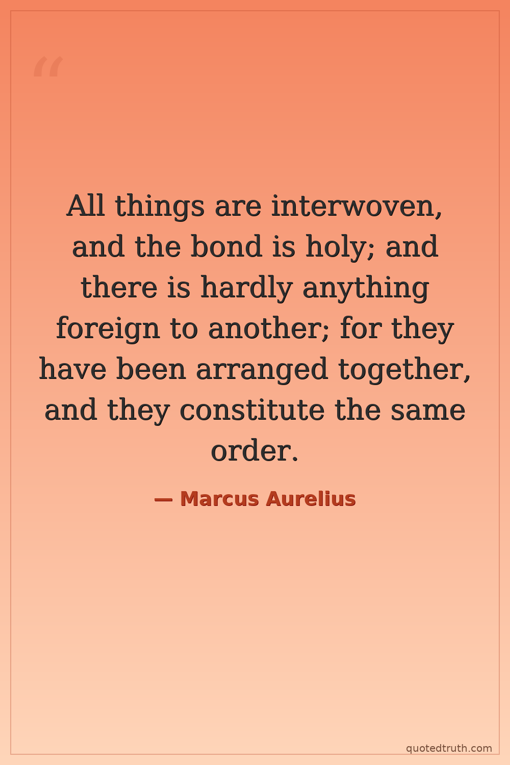 All things are interwoven, and the bond is holy; and there is hardly anything foreign to another; for they have been arranged together, and they constitute the same order.