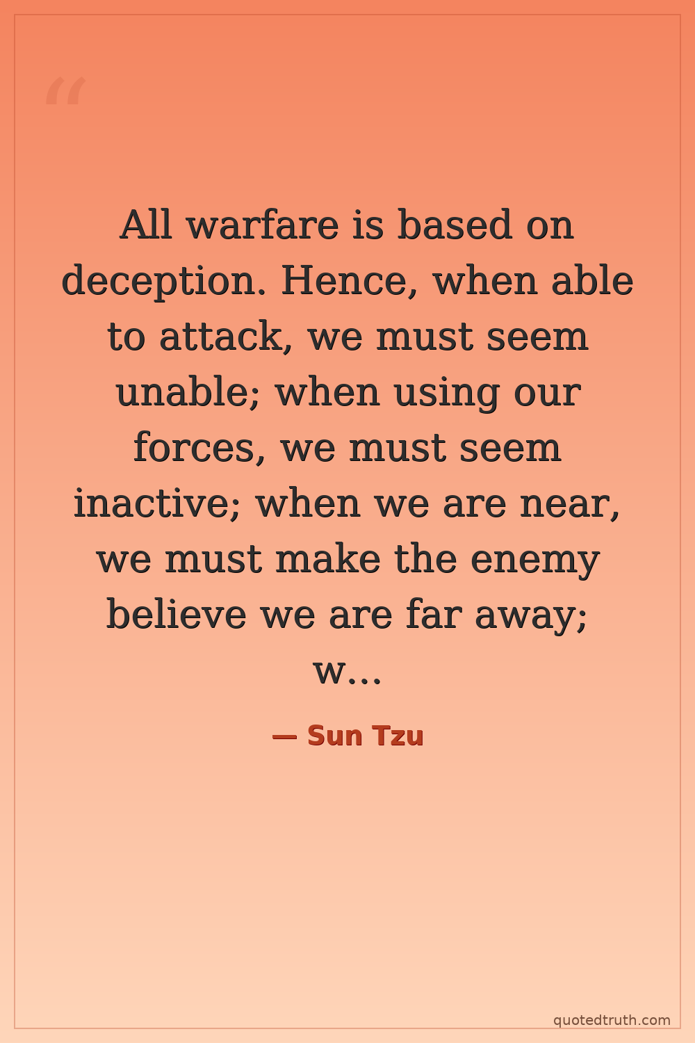 All warfare is based on deception. Hence, when able to attack, we must seem unable; when using our forces, we must seem inactive; when we are near, we must make the enemy believe we are far away; when far away, we must make him believe we are near. — Sun Tzu Ancient The Art of War