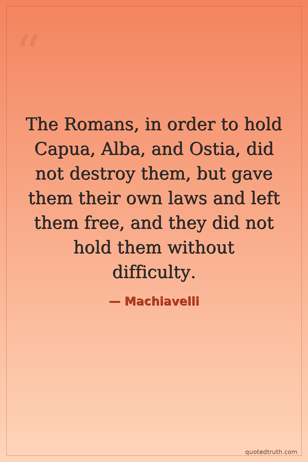 The Romans, in order to hold Capua, Alba, and Ostia, did not destroy them, but gave them their own laws and left them free, and they did not hold them without difficulty.