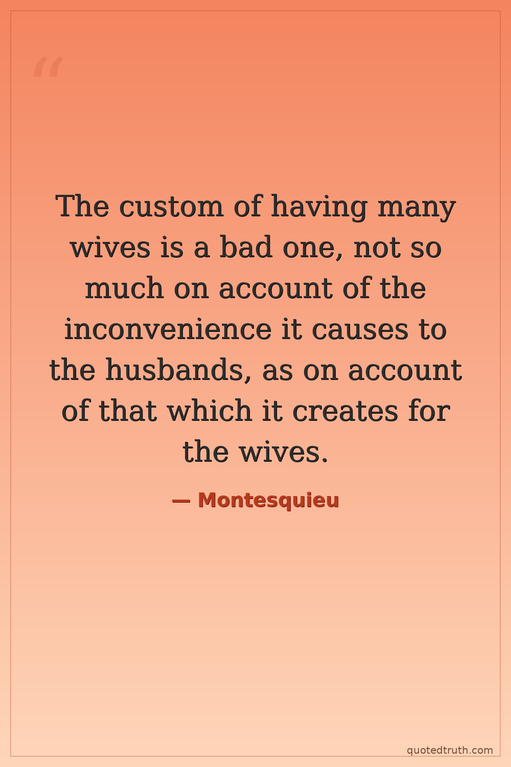 The custom of having many wives is a bad one, not so much on account of the inconvenience it causes to the husbands, as on account of that which it creates for the wives.